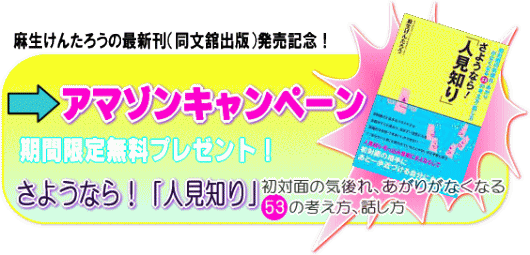 麻生けんたろうの処女作で韓国や台湾、中国でも翻訳されている あがり症対策本 『10人から100人の前でラクに話せる、さようなら!「あがり症」』です。おかげさまでこれまで26版の増刷を重ね、多くの方に読んで頂きました。 プロのアナウンサーも実践している人前で緊張せずに話せる方法を いくつもご紹介していますので、 あがり症の悩みもあるんだというあなたは是非読んでみてください。 |